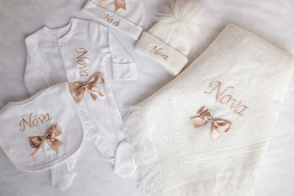 Beautiful 5 piece set, perfect for leaving Hospital. Consists of shawl, babygrow, bib and hospital hat and pom pom hat.